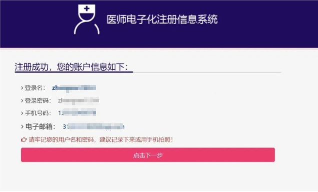 (4)電子化賬戶注冊成功,點擊【點擊下一步】按鈕即可進行登錄。(請牢記您的用戶 名和密碼,建議記錄下來或手機拍照)