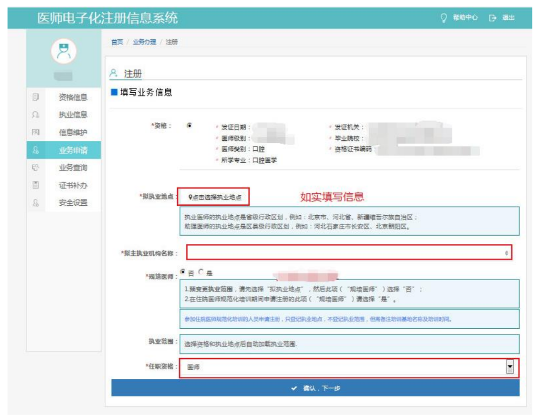 選擇執(zhí)業(yè)地點、選擇主執(zhí)業(yè)機構(gòu)、規(guī)培醫(yī)師選擇“否”,執(zhí)業(yè)范圍、任職資格等,填寫完成后,點擊“確認,下一步”。