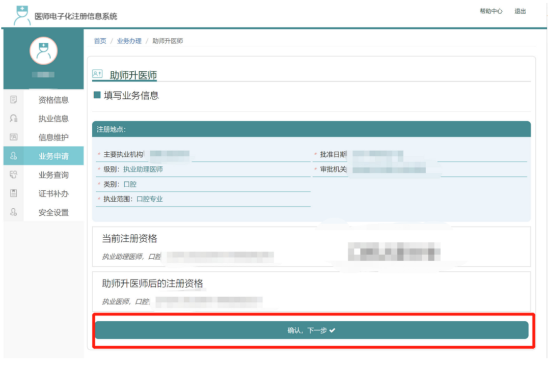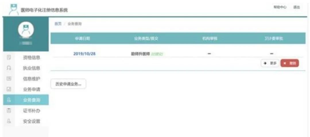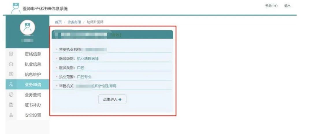 (2)助理升執(zhí)業(yè)(同一個醫(yī)療機構(gòu)),點擊業(yè)務(wù)申請,選擇助理升執(zhí)業(yè)。