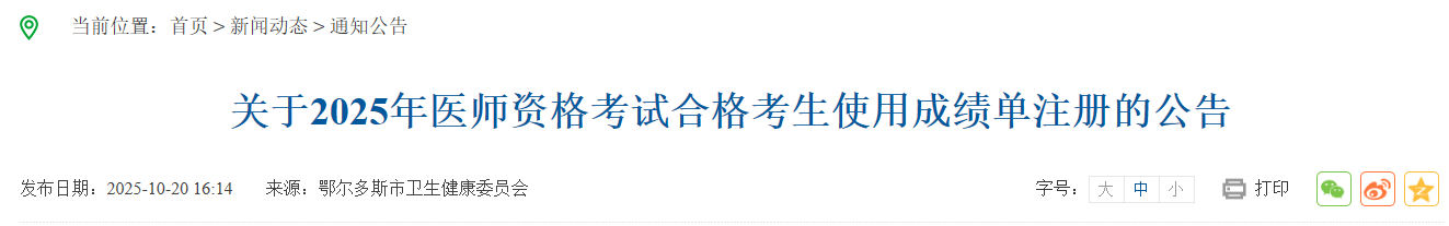 速報(bào)!內(nèi)蒙古鄂爾多斯2025年醫(yī)師資格考試證書(shū)注冊(cè)已開(kāi)始!合格考生可以使用成績(jī)單進(jìn)行注冊(cè),以下為考點(diǎn)官方通知。
