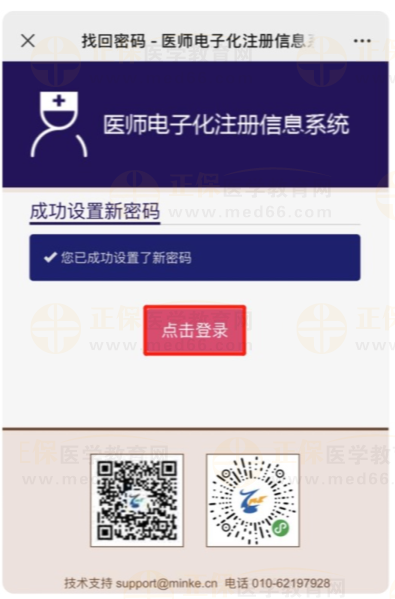 ④成功設(shè)置新密碼,【點(diǎn)擊登錄】直接進(jìn)入您的醫(yī)師電子化系統(tǒng),同時自動綁定微信登錄。