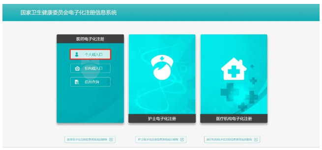 2、在“國家衛(wèi)生健康委員會電子化注冊信息系統(tǒng)”頁面,點擊“醫(yī)師電子化注冊——個人端入口”。