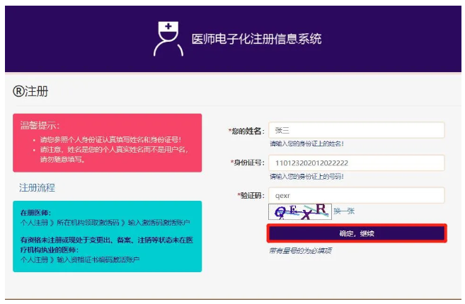 4、填寫注冊信息,輸入“您的姓名”和“身份證號”,填寫正確的“驗證碼”后,點擊【確定,繼續(xù)】。