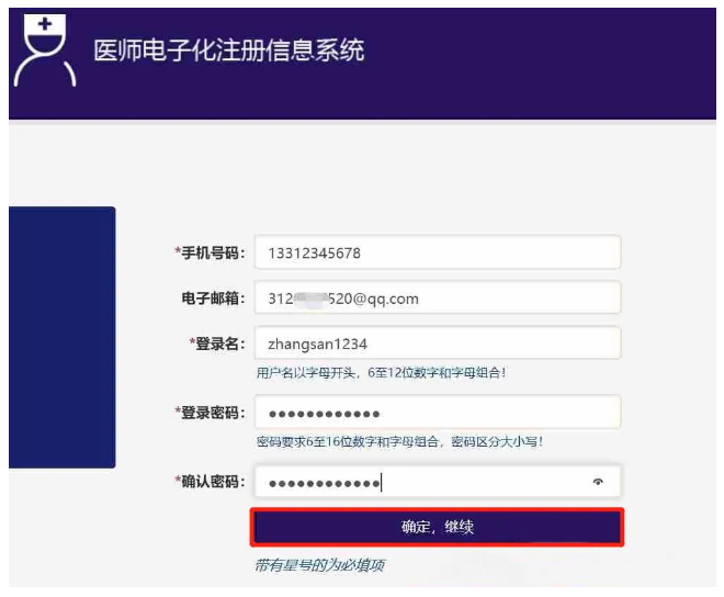 5、填寫“手機號”、“電子郵箱”、“登錄名”,正確設置“登錄密碼”和“確認密碼”后,點擊【確定,繼續(xù)】。