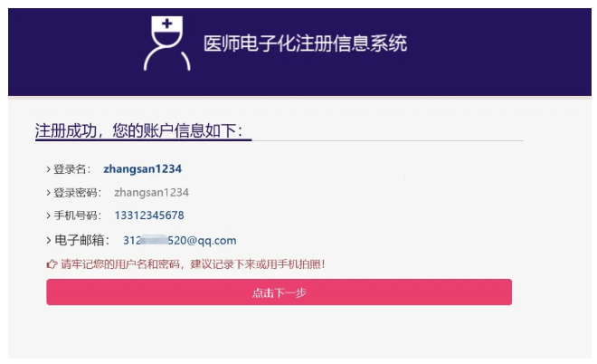 6、電子化賬戶注冊成功,點擊【點擊下一步】按鈕即可進行登錄。(請牢記您的用戶名和密碼,建議記錄下來或手機拍照)