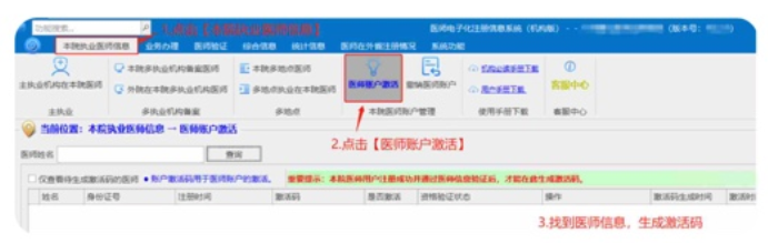 醫(yī)師個人電子化注冊信息驗證通過后,由當前注冊所在的執(zhí)業(yè)機構“生成激活碼”激活賬戶。主執(zhí)業(yè)機構登錄《醫(yī)師電子化注冊系統(tǒng)(機構版)》,在“本院執(zhí)業(yè)醫(yī)師信息”--“醫(yī)師賬戶激活”處生成激活碼,醫(yī)師賬戶自動激活,激活后個人端系統(tǒng)開放所有功能。