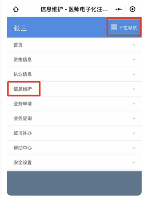3、點擊右上角【下拉導(dǎo)航】進入【信息維護】功能