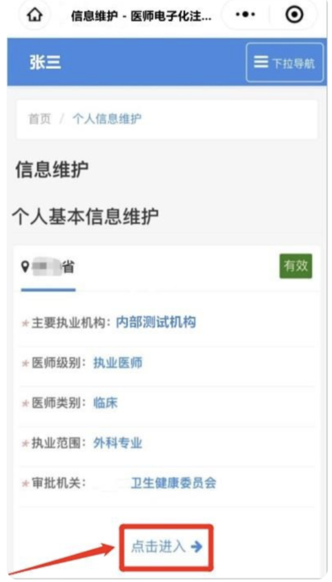 4、點擊您需要維護的執(zhí)業(yè)信息下的【點擊進入】按鈕