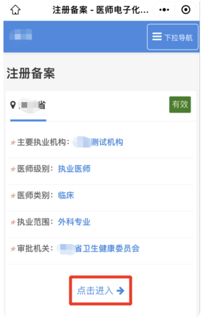 4、點(diǎn)擊需備案執(zhí)業(yè)信息下的【點(diǎn)擊進(jìn)入】按鈕