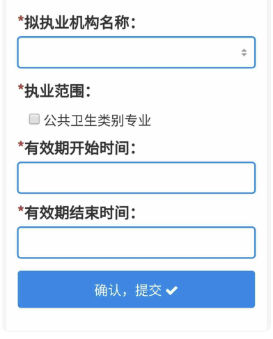 4、然后填寫業(yè)務(wù)信息,擬執(zhí)業(yè)機(jī)構(gòu)名稱、執(zhí)業(yè)范圍、有效期開始時(shí)間和有效期結(jié)束時(shí)間。填寫完成后,點(diǎn)擊“確認(rèn),提交”