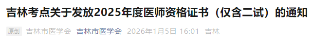 吉林市2025年醫(yī)師資格(二試)證書郵寄地址1月6日起電話確認!