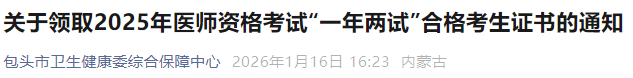 內(nèi)蒙古包頭2025年醫(yī)師資格(二試)證書(shū)1月20日開(kāi)始發(fā)放!