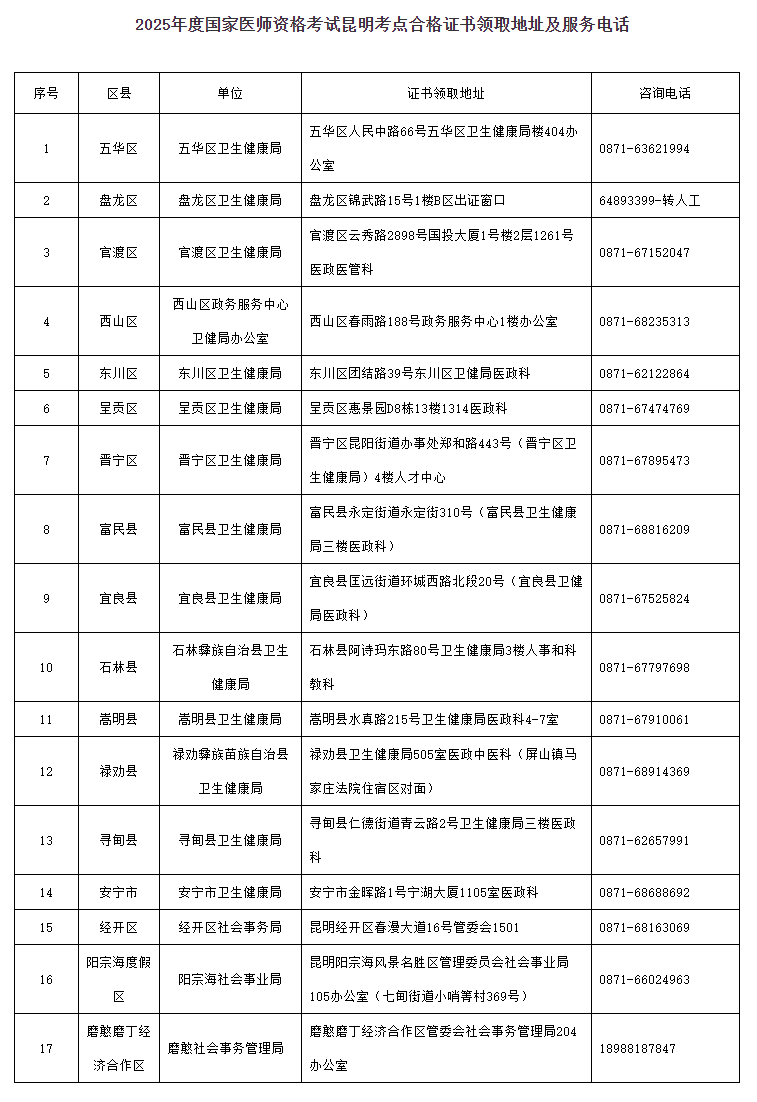 屬于昆明市轄區(qū)內(nèi)各縣(市)區(qū)衛(wèi)健局報(bào)名點(diǎn)申報(bào),并參加醫(yī)學(xué)綜合筆試成績(jī)合格的考生,可于2026年1月26日后聯(lián)系各自所屬縣(市)區(qū)衛(wèi)生健康局報(bào)名點(diǎn)領(lǐng)取資格證書。
