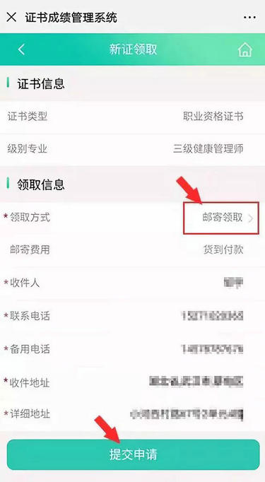 核對(duì)好證書(shū)信息,并且選擇“郵寄領(lǐng)取”,填寫(xiě)相關(guān)信息后,點(diǎn)擊“提交申請(qǐng)”