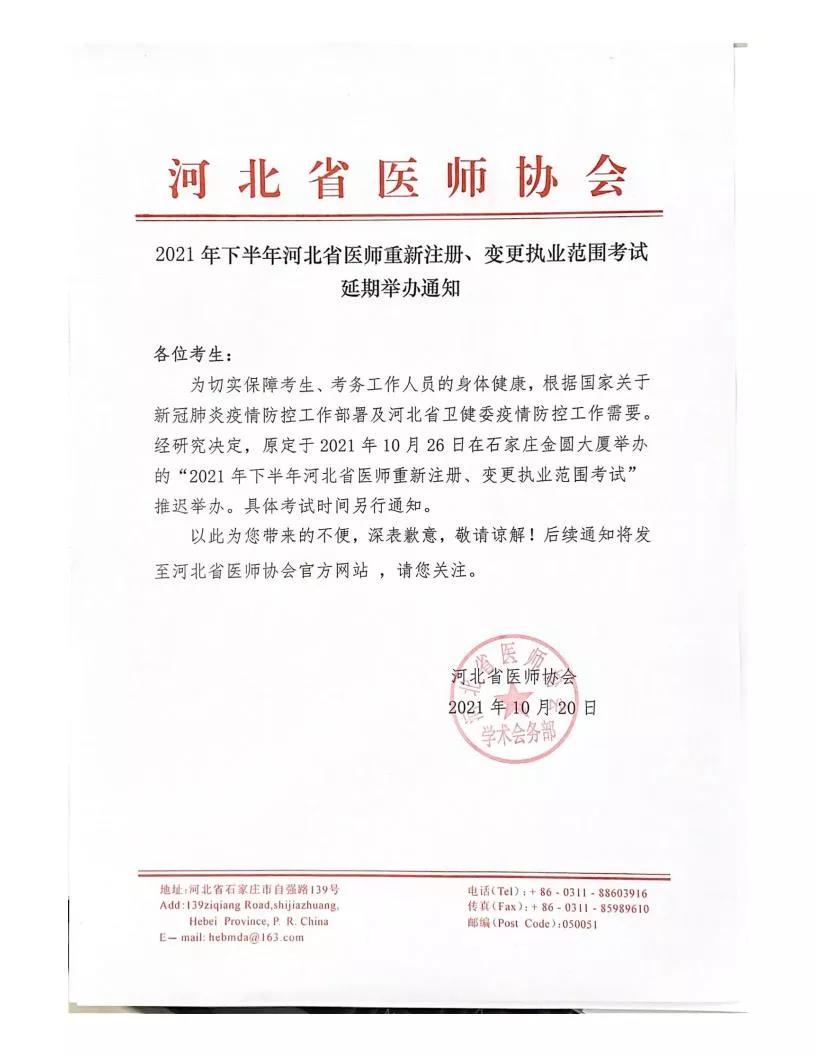 根據(jù)國家及河北省疫情防控工作需要,茲定于10月26日在石家莊舉辦的“2021年下半年河北省醫(yī)師重新注冊、變更執(zhí)業(yè)范圍考試”將延期舉行,具體考試時間另行通知。