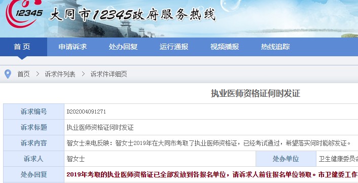 大同市衛(wèi)健委回復(fù):2019年考取的執(zhí)業(yè)醫(yī)師資格證已全部發(fā)放到各報名單位,請訴求人前往報名單位領(lǐng)取。