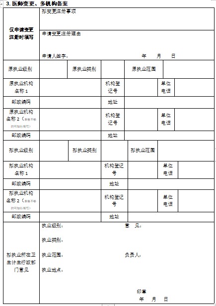 8.申請(qǐng)醫(yī)師執(zhí)業(yè)注冊(cè)應(yīng)填寫(xiě)表2、申請(qǐng)變更、多機(jī)構(gòu)備案應(yīng)填寫(xiě)表3。