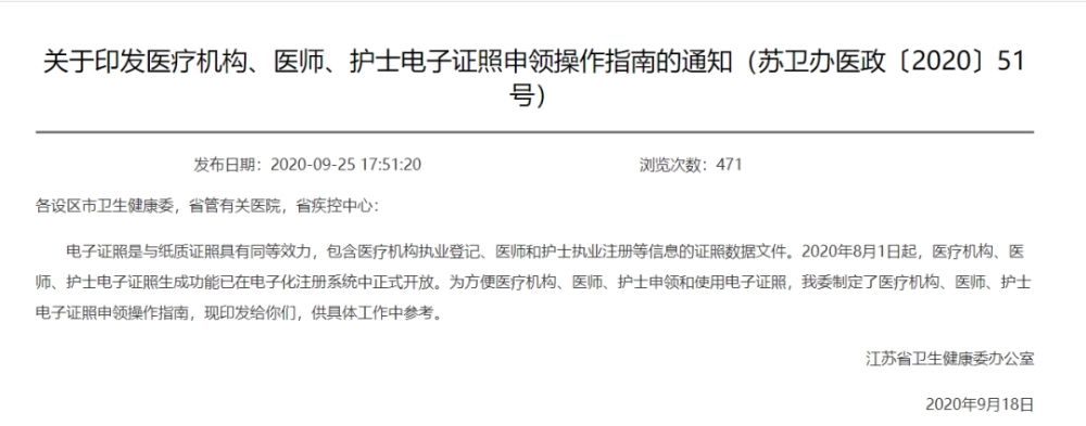 為方便醫(yī)療機構、醫(yī)師、護士申領電子證照,醫(yī)療機構管理本機構的醫(yī)師和護士電子證照信息,各級衛(wèi)生健康部門管理和統(tǒng)計本轄區(qū)醫(yī)療機構、醫(yī)師、護士的電子證照信息,制定本操作指南。