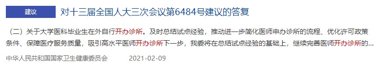 代表提出的《關于完善醫(yī)療系統(tǒng)及增加醫(yī)療開支投入的建議》,十三屆全國人大三次會議第6484號建議答復,其中提到關于大學醫(yī)科畢業(yè)生在外自行開辦診所的答復,我們一起來看看!