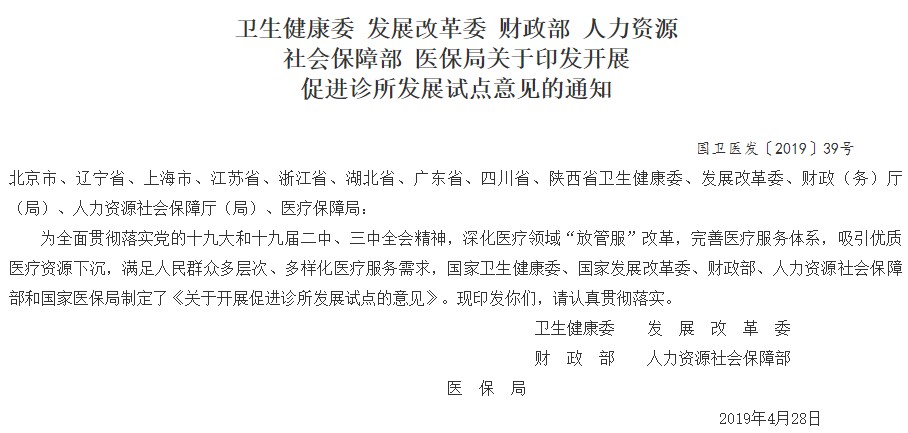 五大部門關(guān)于印發(fā)開展促進診所發(fā)展試點意見的通知
