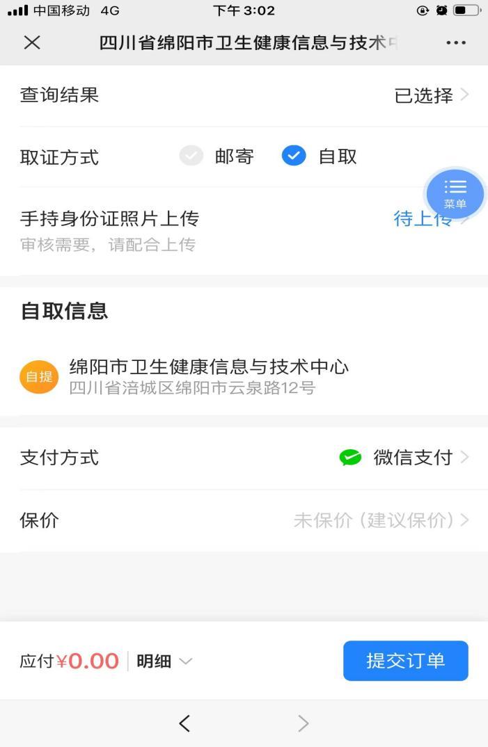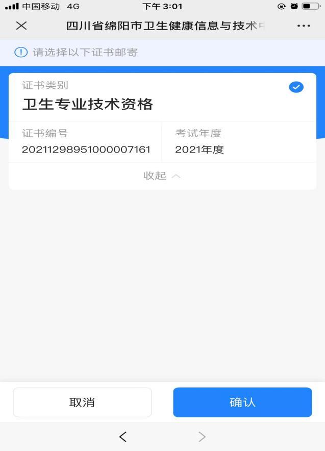 關(guān)注“健康綿州”微信公眾號,選擇我的、證書郵寄