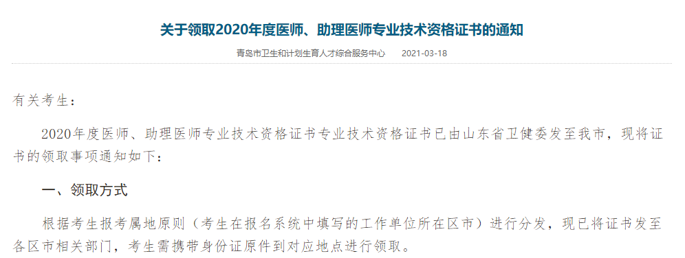 關(guān)于領(lǐng)取青島考點(diǎn)2020年醫(yī)師、助理醫(yī)師資格證書的通知