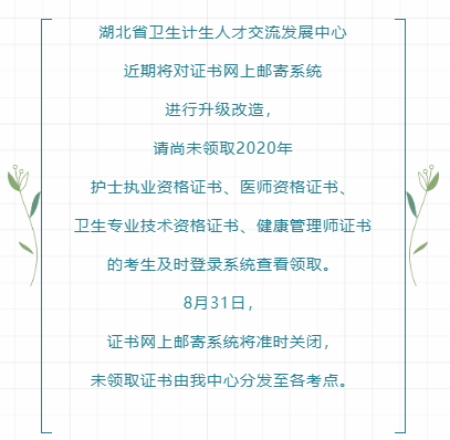 湖北省發(fā)布了關(guān)于領(lǐng)取2020年醫(yī)師資格證書的通知,請尚未領(lǐng)取2020年醫(yī)師資格證書的考生及時(shí)登錄證書網(wǎng)上郵寄系統(tǒng)查看領(lǐng)取。8月31日證書網(wǎng)上郵寄系統(tǒng)將準(zhǔn)時(shí)關(guān)閉,未領(lǐng)取證書由我中心分發(fā)至各考點(diǎn)。具體通知內(nèi)容醫(yī)學(xué)教育網(wǎng)小編搜集整理如下: