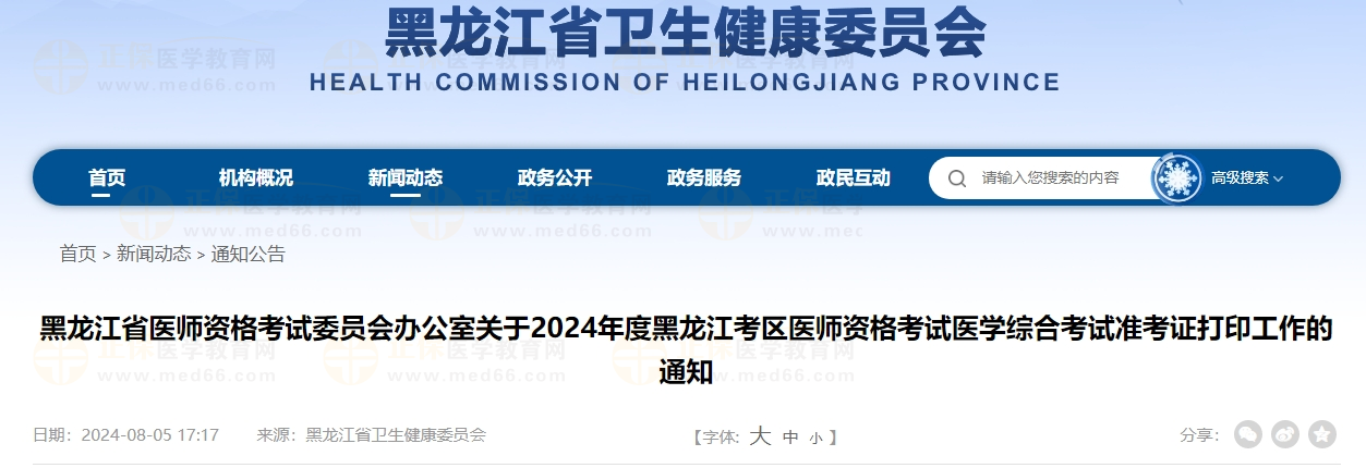 2024年度黑龍江考區(qū)醫(yī)師資格考試醫(yī)學(xué)綜合考試準(zhǔn)考證打印工作的通知