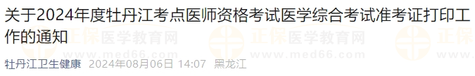 2024年黑龍江牡丹江考點(diǎn)醫(yī)師綜合筆試考試準(zhǔn)考證打印入口8月6日正式開通
