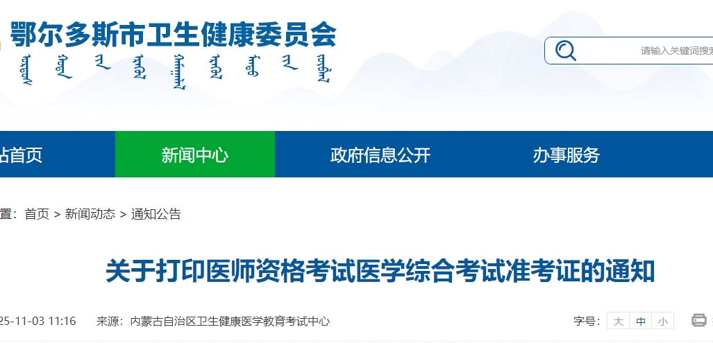 內(nèi)蒙古鄂爾多斯2025年醫(yī)師資格“一年兩試”準考證打印開始!