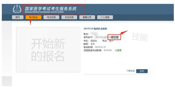 二、河北考區(qū)將于8月7日10:00開放準(zhǔn)考證打印功能,請考生及時登陸國家醫(yī)學(xué)考試網(wǎng)(www.nmec.org.cn),進入“國家醫(yī)學(xué)考試考生服務(wù)系統(tǒng)——個人界面”點擊準(zhǔn)考證號后的“打印”按鈕,打印準(zhǔn)考證(如下圖)。