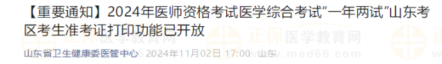 山東考區(qū)2024年醫(yī)師資格考試“一年兩試”考生準(zhǔn)考證打印已開始!