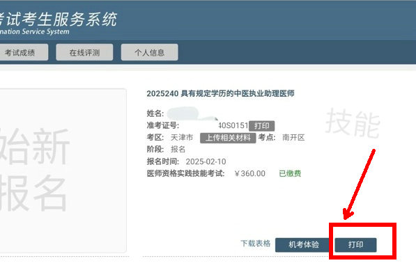 天津市2025年醫(yī)師資格實(shí)踐技能準(zhǔn)考證打印入口已經(jīng)開(kāi)通!其它地區(qū)準(zhǔn)考證打印入口陸續(xù)開(kāi)通中,主要集中在考前一周進(jìn)行打印,各位考生稍安勿躁,耐心等待!
