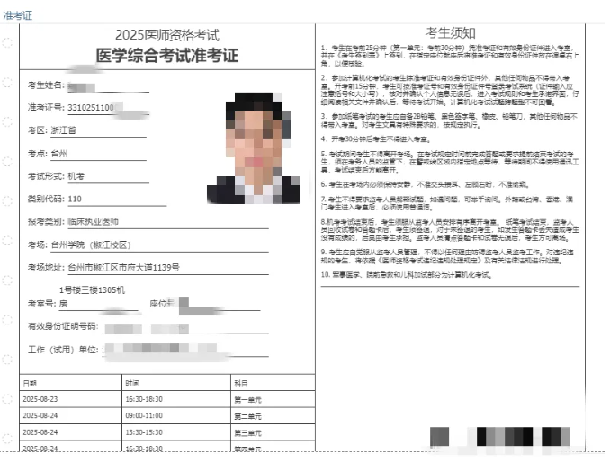 浙江臺州2025年醫(yī)師資格綜合筆試準(zhǔn)考證8月15日起打印,速看考場安排!