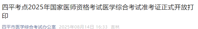 吉林四平2025年醫(yī)師資格綜合筆試考生速看:準考證打印入口開通!