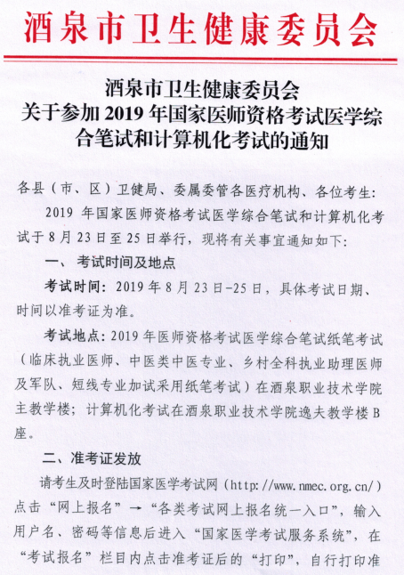 根據(jù)《酒泉市衛(wèi)健委關(guān)于2019年醫(yī)師資格綜合筆試及計算機化考試通知》得知,酒泉市2019年醫(yī)師資格綜合筆試準考證打印入口已開通。醫(yī)學(xué)教育網(wǎng)編輯提醒您及時登錄國家醫(yī)學(xué)考試中心打印準考證。
