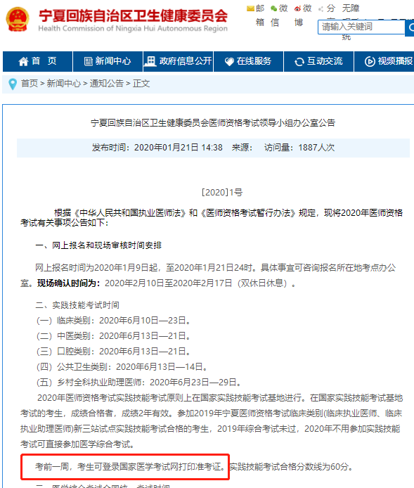 2020年醫(yī)師資格考試實踐技能考試原則上在國家實踐技能考試基地進行。在國家實踐技能考試基地考試的考生,成績合格者,成績2年有效。參加2019年寧夏醫(yī)師資格考試臨床類別(臨床執(zhí)業(yè)醫(yī)師、臨床執(zhí)業(yè)助理醫(yī)師)新三站試點實踐技能考試合格的考生,2019年綜合考試未過,2020年不用參加實踐技能考試可直接參加醫(yī)學(xué)綜合考試。