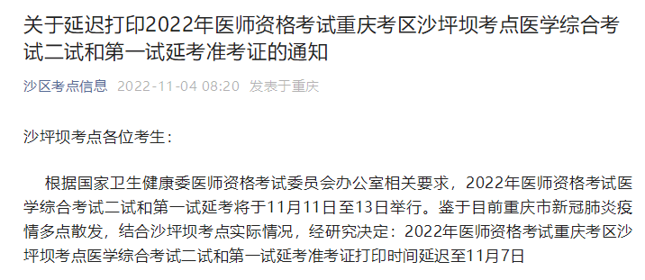 關(guān)于延遲打印2022年醫(yī)師資格考試重慶考區(qū)沙坪壩考點(diǎn)醫(yī)學(xué)綜合考試二試和第一試延考準(zhǔn)考證的通知