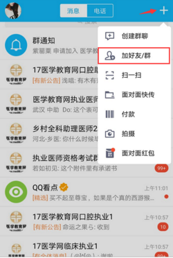 方法二:打開手機qq,點擊屏幕右上角“+”標識,添加群
