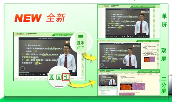 正保醫(yī)學教育網是行業(yè)率先采用高清視頻技術,實現(xiàn)寬屏高清課件授課。整套系統(tǒng)包括高清視頻教學演示屏、全高清錄制及后期制作設備,在教學設計、教學形式、畫面呈現(xiàn)、學習體驗等各個方面進行了升級。升級后的課程具有七大功能:仿真高清課堂,同步板書,講座/講義切換,單屏 / 雙屏 / 三分屏模式,顯示/隱藏老師,語速調節(jié),F(xiàn)lash流媒體技術,使學員享有身臨其境的學習感受。