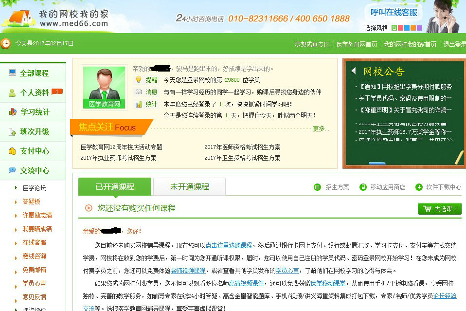 醫(yī)學(xué)教育網(wǎng)“我的網(wǎng)校我的家”的功能有:我的課程、我的題庫、學(xué)習(xí)記錄、學(xué)習(xí)資料、答疑板、我的賬戶、繼續(xù)教育中心、網(wǎng)校論壇、博客、郵件中心等。學(xué)員可以在里面修改完善自己的個(gè)人資料,并且可以查看聽課記錄、答疑記錄和練習(xí)記錄。系統(tǒng)還會(huì)不時(shí)為學(xué)員推薦課程?傊,后