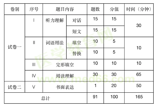 全國醫(yī)學(xué)博士外語統(tǒng)一考試試卷結(jié)構(gòu)
