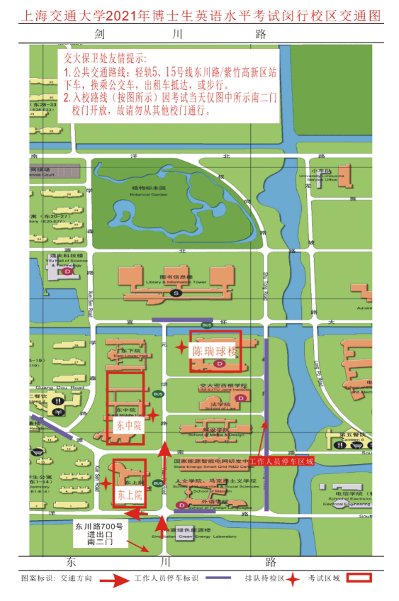 3.考生的具體考場(考試教室)安排見準(zhǔn)考證,考生請從南二門(東川路700號)入校,南二門(圖中入口):06:30—考試結(jié)束(臨時(shí)開放)