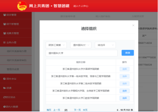 原畢業(yè)院校團(tuán)的基層委員會(huì)在團(tuán)員證“組織關(guān)系轉(zhuǎn)接”欄內(nèi)填寫團(tuán)員轉(zhuǎn)出組織關(guān)系的時(shí)間,注明團(tuán)費(fèi)交繳情況,并加蓋“中國共產(chǎn)主義青年團(tuán)***委員會(huì)”章。同時(shí)登錄“智慧團(tuán)建”系統(tǒng),點(diǎn)擊業(yè)務(wù)辦理,將團(tuán)組織關(guān)系轉(zhuǎn)入溫州醫(yī)科大學(xué)擬錄取學(xué)院所在團(tuán)委(創(chuàng)新創(chuàng)業(yè)教育學(xué)院和卓越中心轉(zhuǎn)入“機(jī)關(guān)團(tuán)總支”。具體操作流程為“選擇組織”里依次選擇“團(tuán)浙江省委”,“溫州醫(yī)科大學(xué)”,“浙江省溫州醫(yī)科大學(xué)XX學(xué)院團(tuán)委”(或“機(jī)關(guān)團(tuán)總支”)。