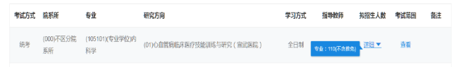 (1)研招網(wǎng)平臺中,我校招生目錄顯示的擬招生人數(shù)為學(xué)??烧惺崭黝悇e考生的總?cè)藬?shù),其中包括統(tǒng)招、推免、單獨(dú)考試。如下圖示例中,擬招生人數(shù):“專業(yè):110”代表了“(000)不區(qū)分院系所-105101(專業(yè)學(xué)位)內(nèi)科學(xué)”專業(yè)共招收各類別考生共110人。注意:這個不是研究方向的招生人數(shù)。