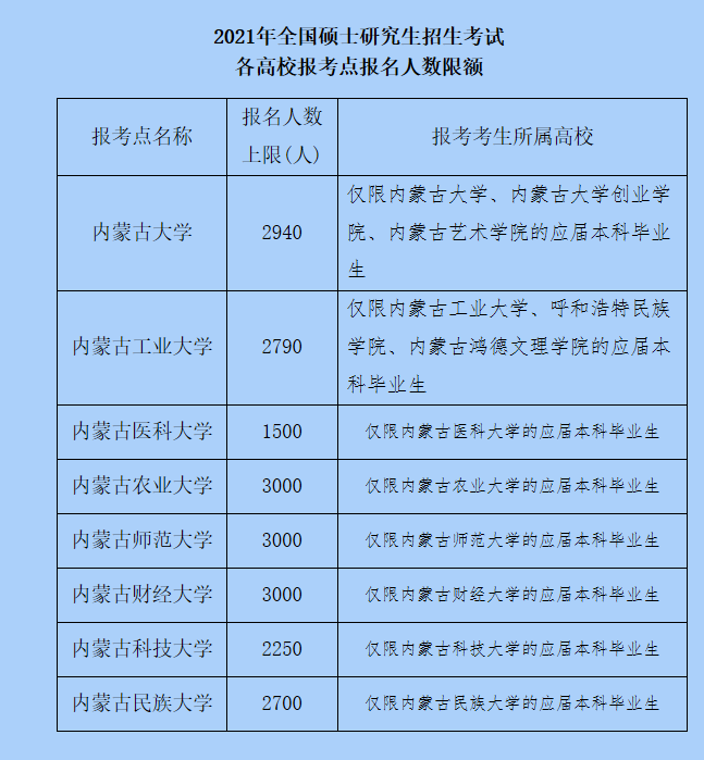 內(nèi)蒙古大學(xué)、內(nèi)蒙古大學(xué)創(chuàng)業(yè)學(xué)院、內(nèi)蒙古藝術(shù)學(xué)院的應(yīng)屆本科畢業(yè)生網(wǎng)上報(bào)名時(shí)應(yīng)選擇內(nèi)蒙古大學(xué)報(bào)考點(diǎn);
