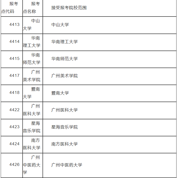 (二)擬在廣東省報(bào)考的考生在選擇報(bào)考點(diǎn)時(shí)須嚴(yán)格遵守報(bào)考點(diǎn)接受范圍,否則報(bào)名結(jié)果無效。具體如下: