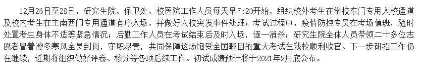 下一步研招工作仍在繼續(xù),近期將組織做好評卷、核分等各項(xiàng)后續(xù)工作。初試成績預(yù)計(jì)將于2021年2月底公布。