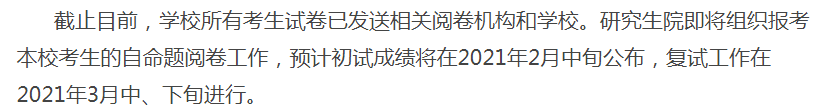 預(yù)計(jì)初試成績將在2021年2月中旬公布,復(fù)試工作在2021年3月中、下旬進(jìn)行。