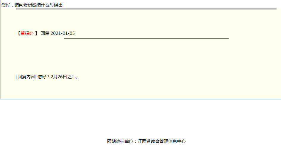 江西省教育管理信息中心回復(fù):2021年考研初試的成績(jī)會(huì)在2月26日之后公布。